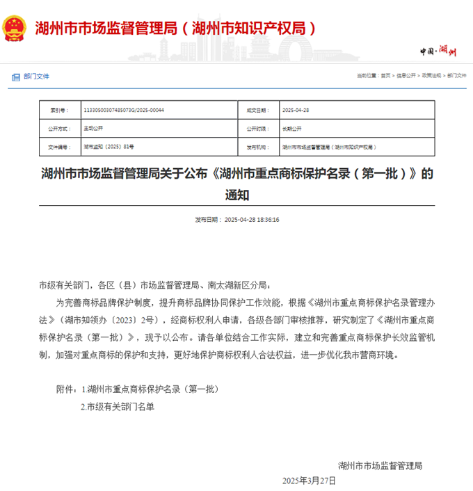 近日,湖州市市场监督管理局公布《湖州市重点商标保护名录(第一批)》,全市共有17件商标入选,“茄子视频色版在线观看”商标位列其中。此次入选标志着茄子视频色版在线观看管道在品牌建设、知识产权保护方面成绩显著,也为企业品牌化发展注入更强劲动力和更有效保障。